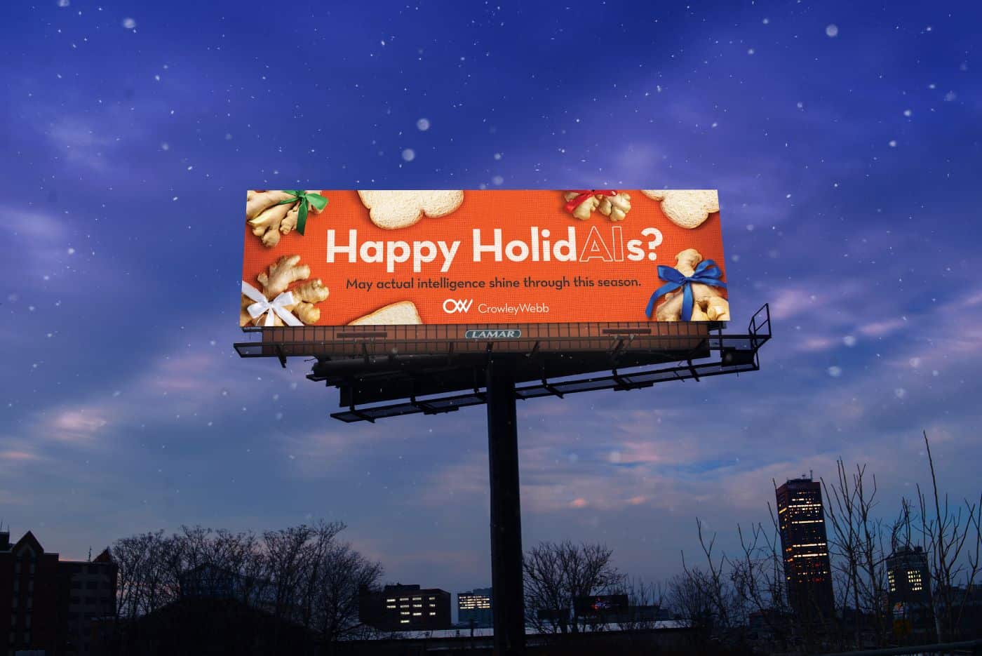 But until we have all the smoldering answers to the aforementioned burning questions, have a look at this year’s Crowley Webb holiday billboard which pays homage to what may prove to be artificial panic. Yummy!